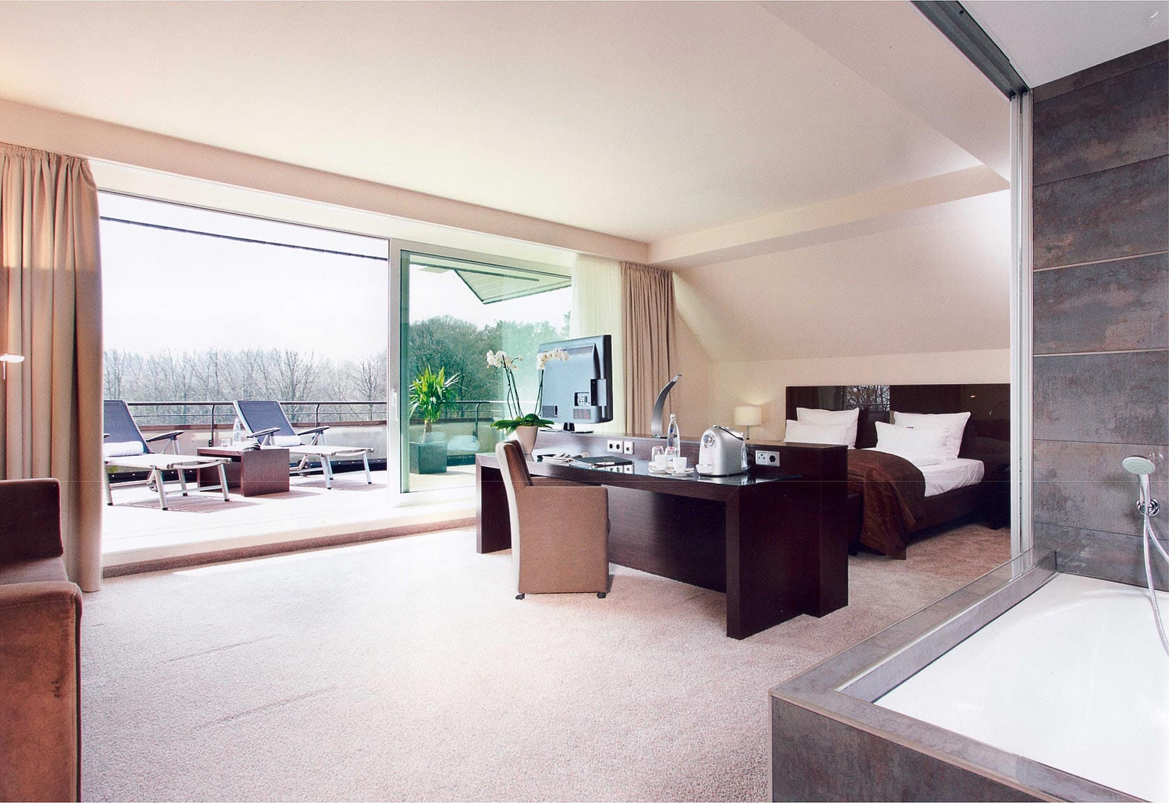 Die zwei eleganten Junior-Suiten versprechen viel Platz auf ca. 45m². Der lichtdurchflutete Wohn- und Schlafbereich bieten Ihnen neben einem Doppelbett (2×90 cm) eine gemütliche Sitzecke. Über die großen Panoramafenster gelangen Sie zur Terrasse mit Blick ins Grüne. Das offen gestaltete Marmor-Badezimmer verfügt über eine große Badewanne sowie Dusche. Ein Wasserkocher für die Teezubereitung sowie eine Kaffeemaschine finden Sie ebenfalls vor.